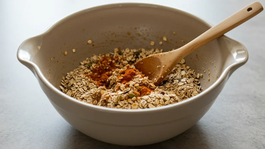 In a large mixing bowl, combine almond flour, rolled oats, turmeric, cinnamon, ginger, baking soda, and sea salt. Stir well to evenly distribute the spices. - Combine Wet Ingredients: