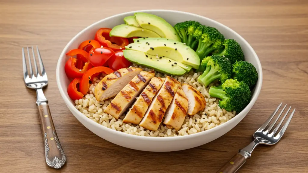 - Ingredients: Grilled chicken breast, brown rice, steamed broccoli, carrots, bell peppers