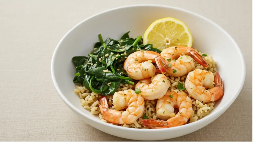 1. Garlic Butter Shrimp with Brown Rice and Spinach