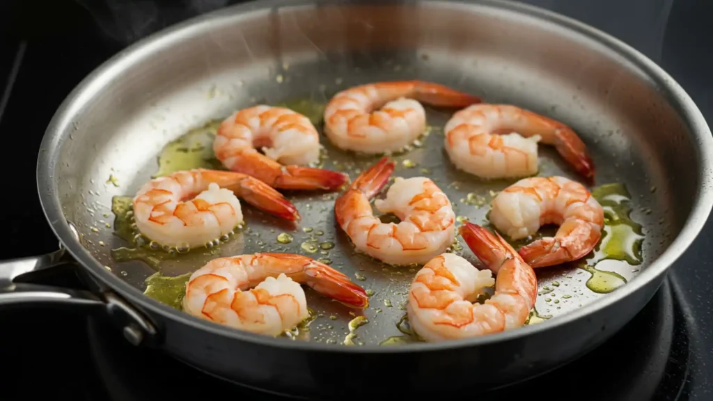 - Cook the Shrimp: Heat olive oil in a skillet over medium heat. Add shrimp and cook for 2–3 minutes on each side until fully cooked and slightly golden.